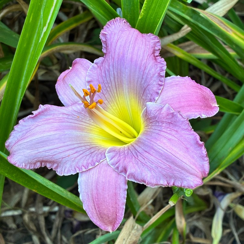 Reilly 11 - 23" EM 5" SEV TET Pale lilac lavender w/graduated blue eye & edge w/gold picotee edge, green throat |