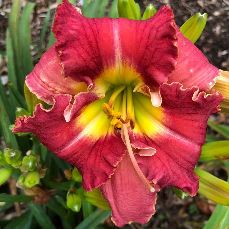 Mason 12 - 52" EM 7" SEV TET Rose pink w/pale grape eye, sepals quill & curl, petals often pinch UF Crispate |