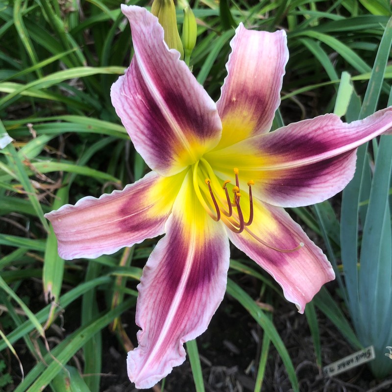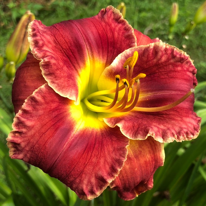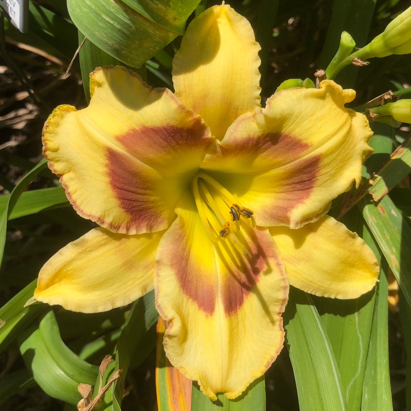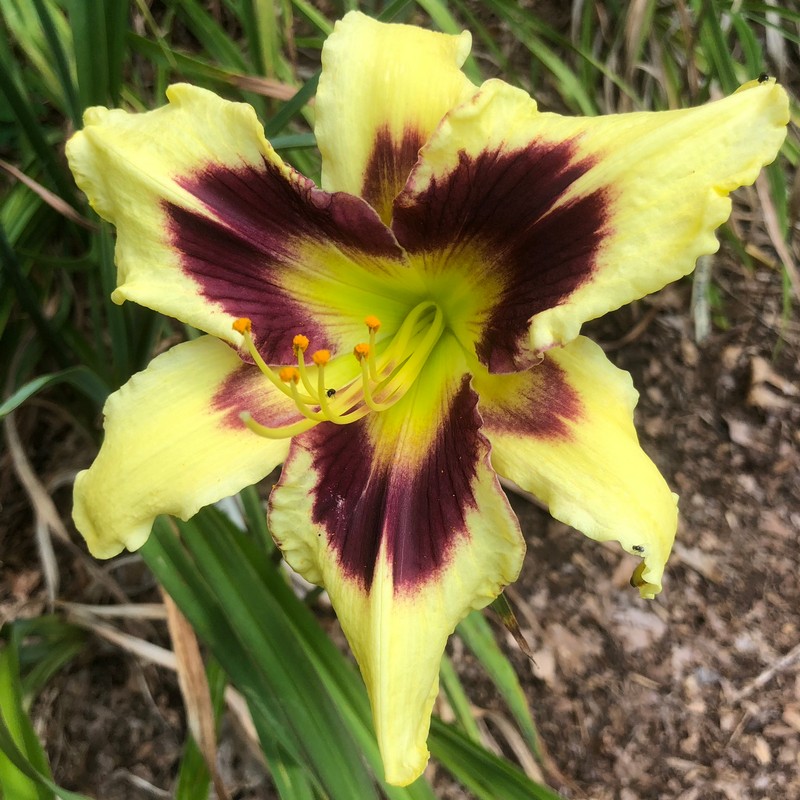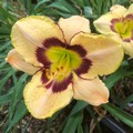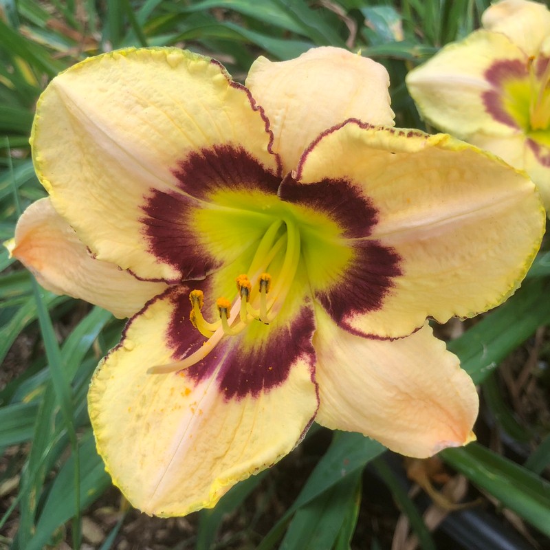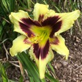 Mason, M 00 - 22" ML 6" SEV TET Yellow w deep burgundy eye and burgundy cream picotee above yellow green tht |