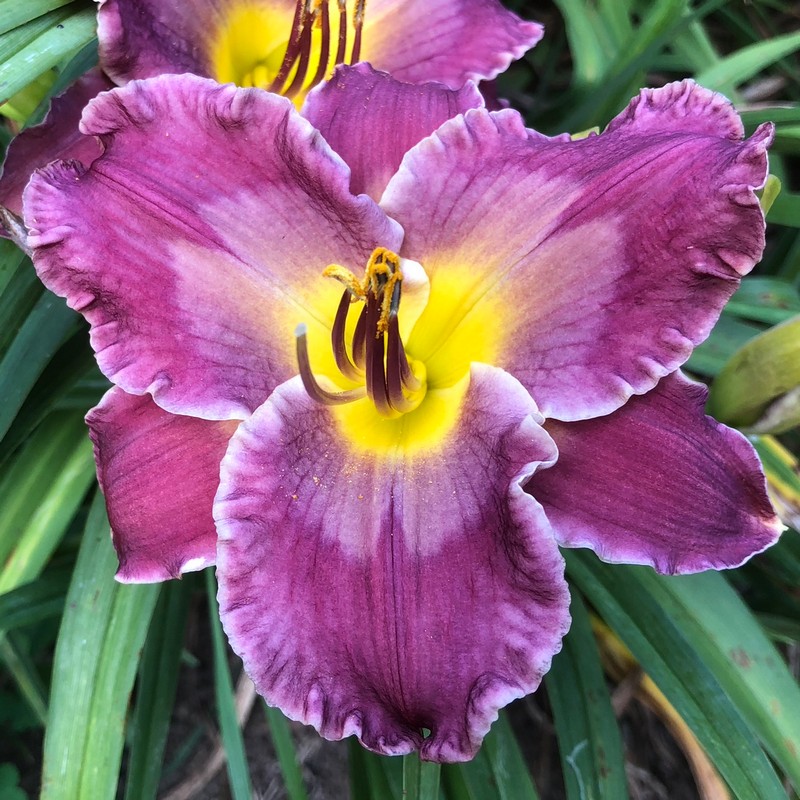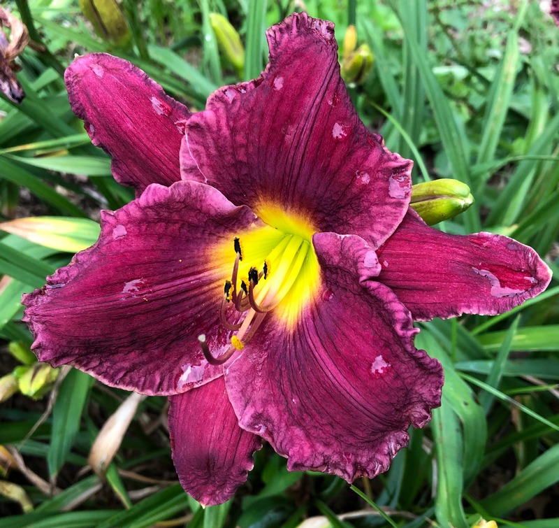 Shooter, J 10 - 28" EM 6" SEV DIP Deep grape purple halo enhances the reddish purple ruffled petals |