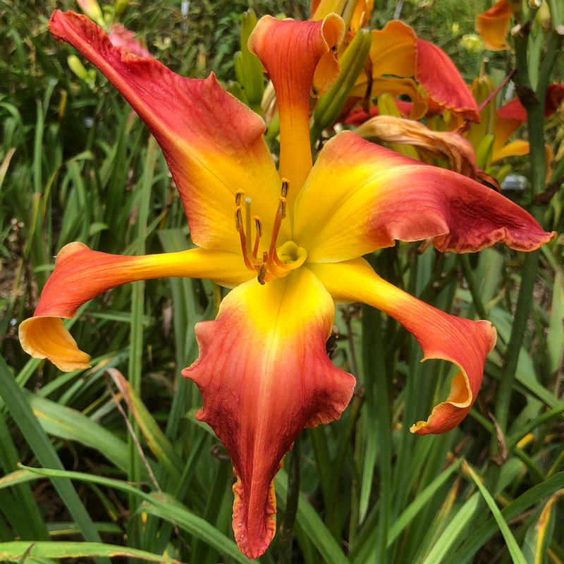 Derrow 17 - 28" EM 6" SEV TET Yellow orange, lighter petal edges with scarlet red flashings on petal centers, lighter broken patterned band outside the dark red eye | |