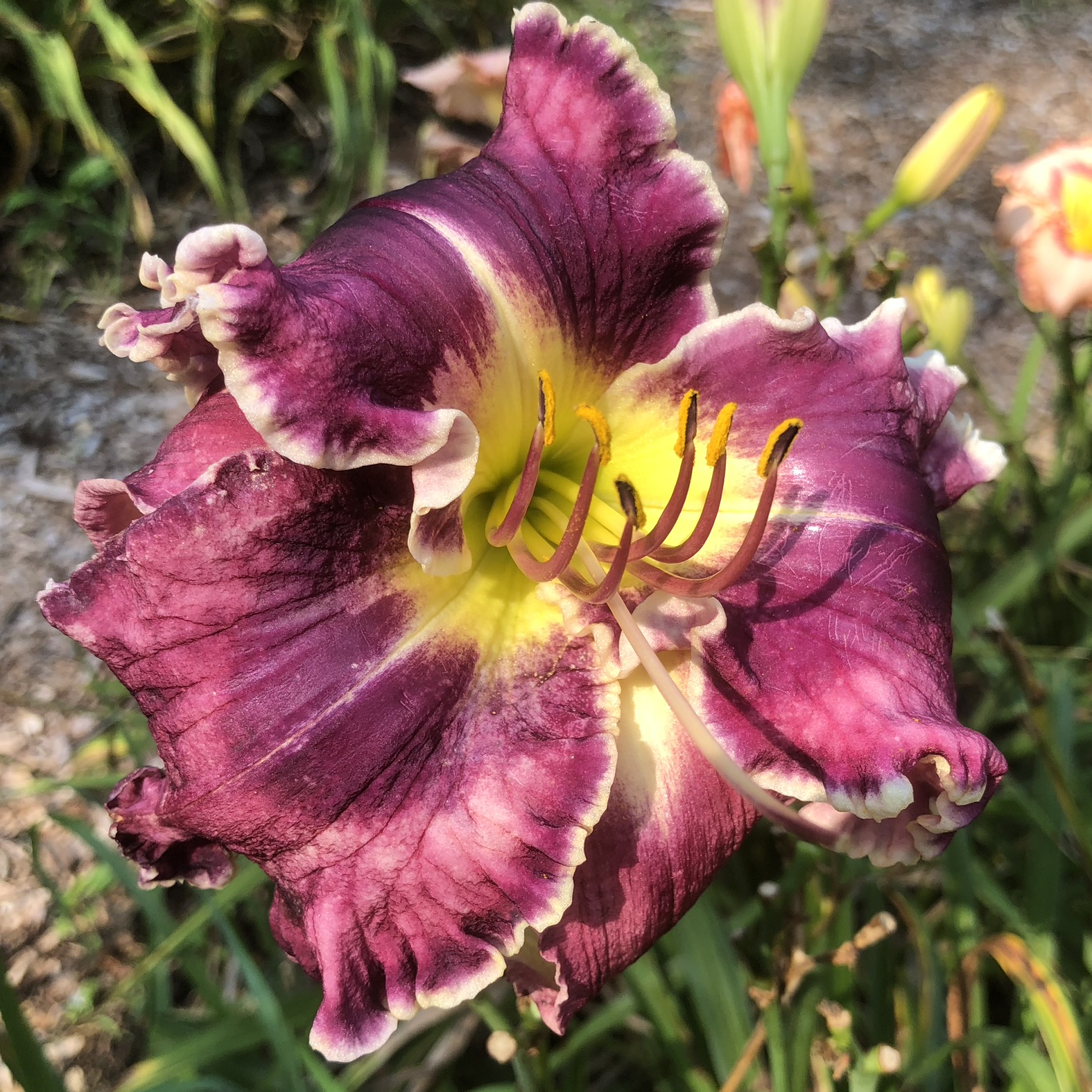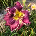 Derrow 22 - 30" M 5.75" SEV TET Near white with purple eye picotee edge, eye + sepals multiple chevron patterns |