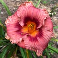 Herington, K 06 - 24" EM 4.25" SEV TET Pink with cherry red eye, gold edge, green throat | |