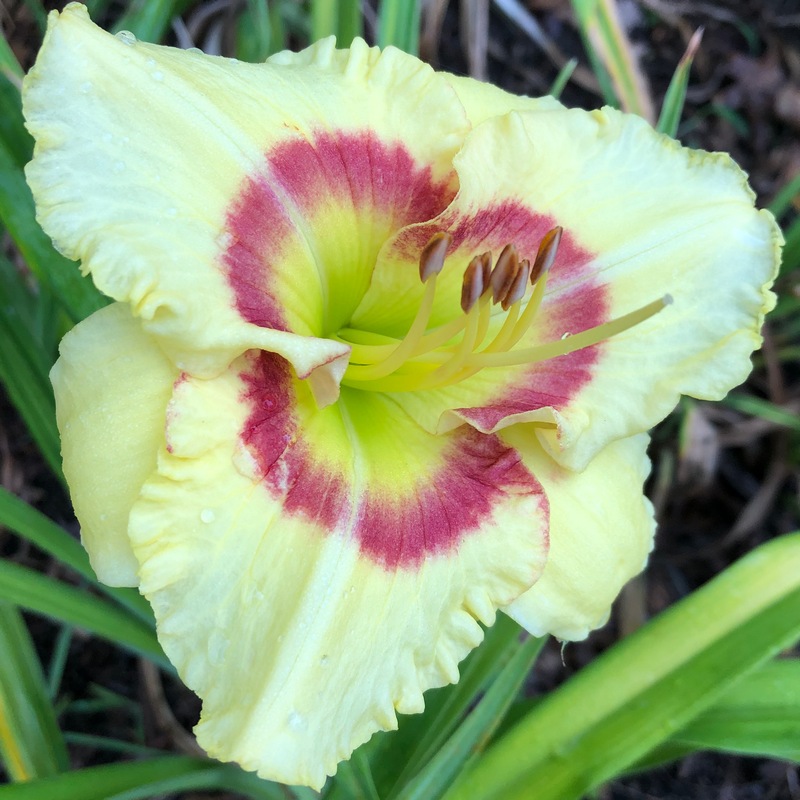 Emmerich 20 - 40" EM 8" SEV TET Very dark cranberry grape, can also be cranberry merlot or dark cranberry or merlot depending on the weather, one third midribs, white edge, green throat, and pinched petals UF, Crispate, Vfra |