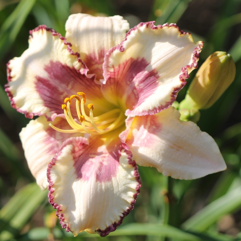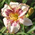 Derrow 22 - 30" M 5.75" SEV TET Near white with purple eye picotee edge, eye + sepals multiple chevron patterns |